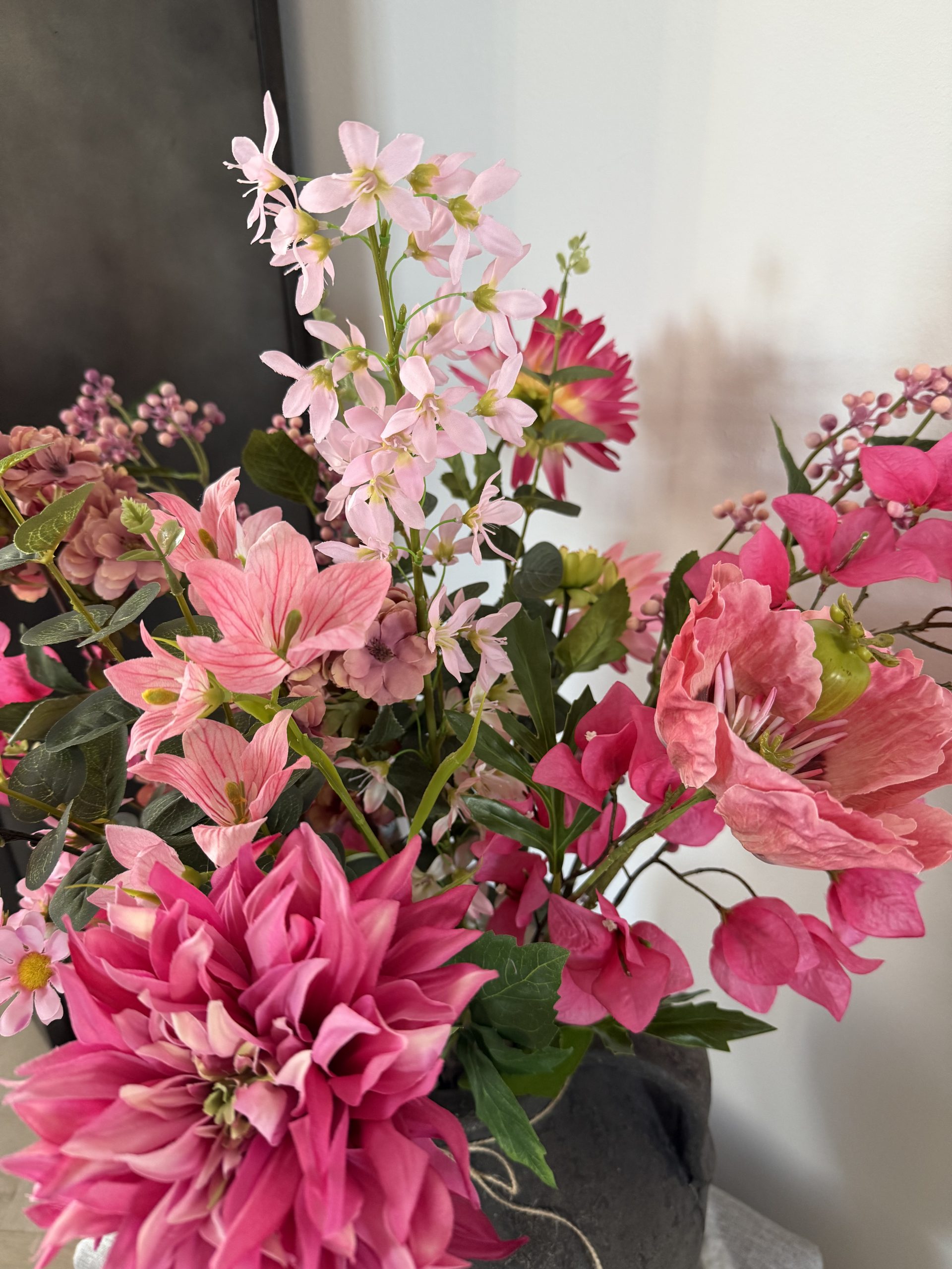 Een stijlvol en royaal zijden boeket in warme roze tinten, prachtig geschikt in een robuuste donkerstenen pot. Country Rose Charm voegt direct landelijke charme toe aan ieder interieur – perfect voor op tafel, in de hal of als blikvanger in de woonkamer.