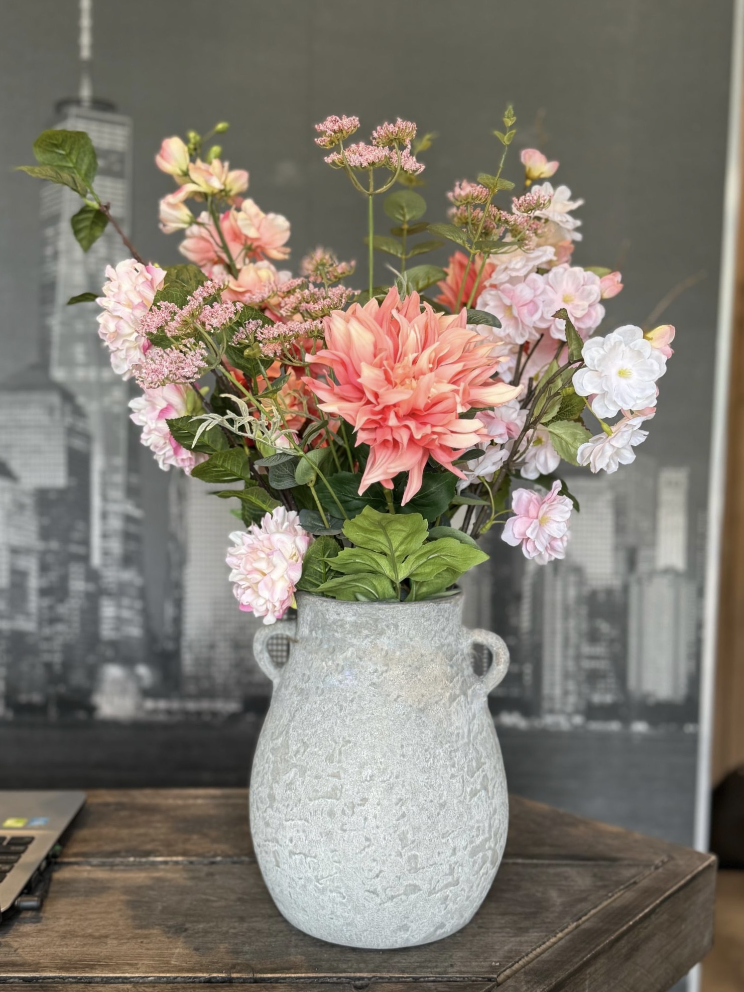 Soft Blush Stone is een elegant zijden boeket in zachte lichtroze tinten, stijlvol geschikt in een stoere, grijze stenen vaas. De combinatie van verfijnde bloemen met het robuuste karakter van de vaas maakt dit arrangement een subtiele blikvanger in ieder interieur.