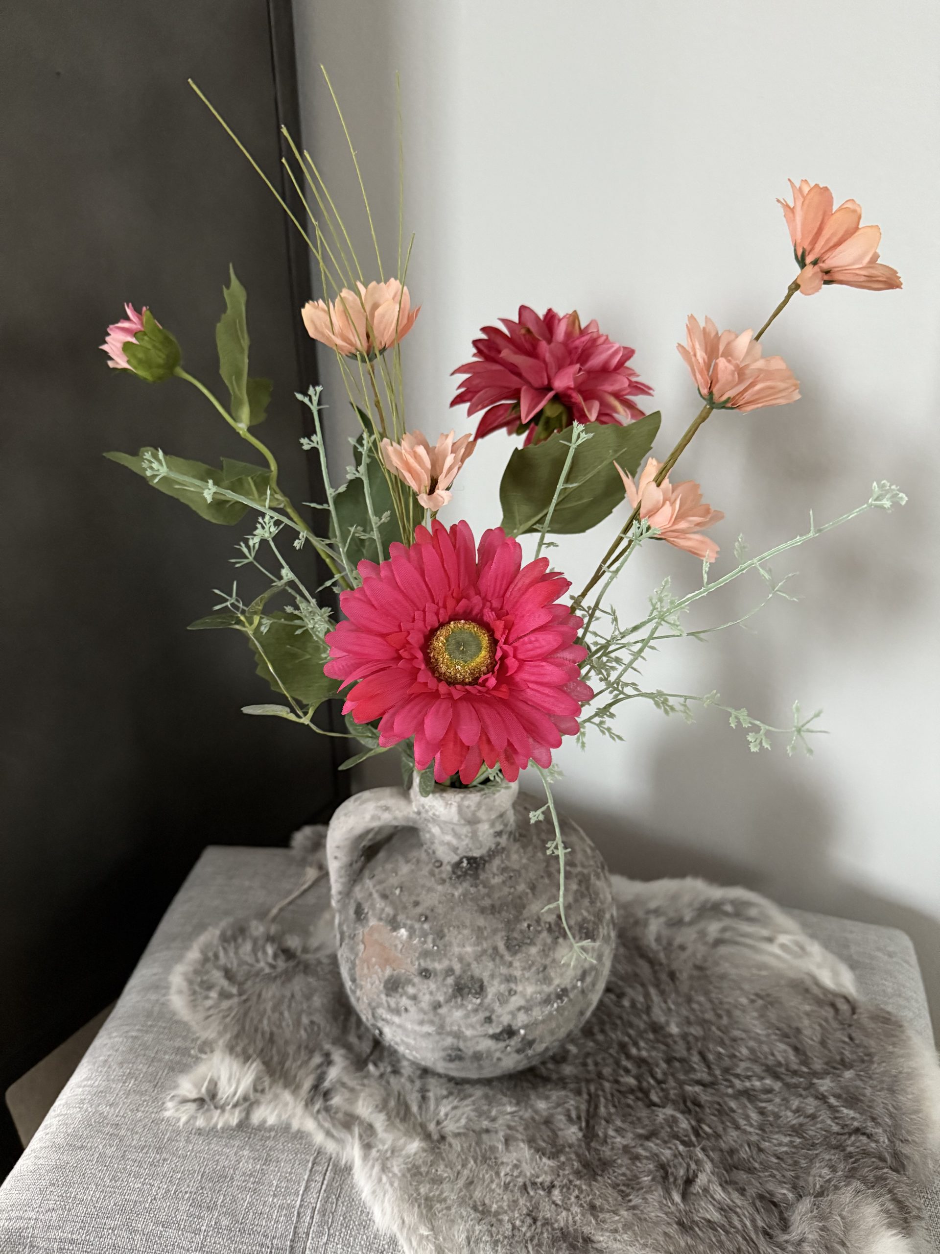 Klein van stuk, groots in charme – Sweet Petite is een sfeervol zijden boeketje in zachte roze tinten, stijlvol geplaatst in een bolle kruik met een warme uitstraling. De combinatie van natuurlijke vormen en lieflijke kleuren maakt dit arrangement een subtiele blikvanger in elk interieur.
